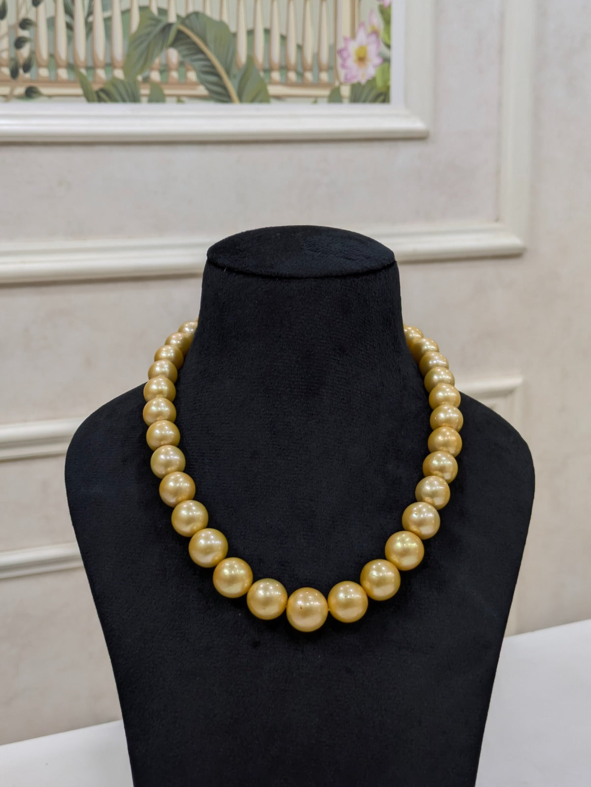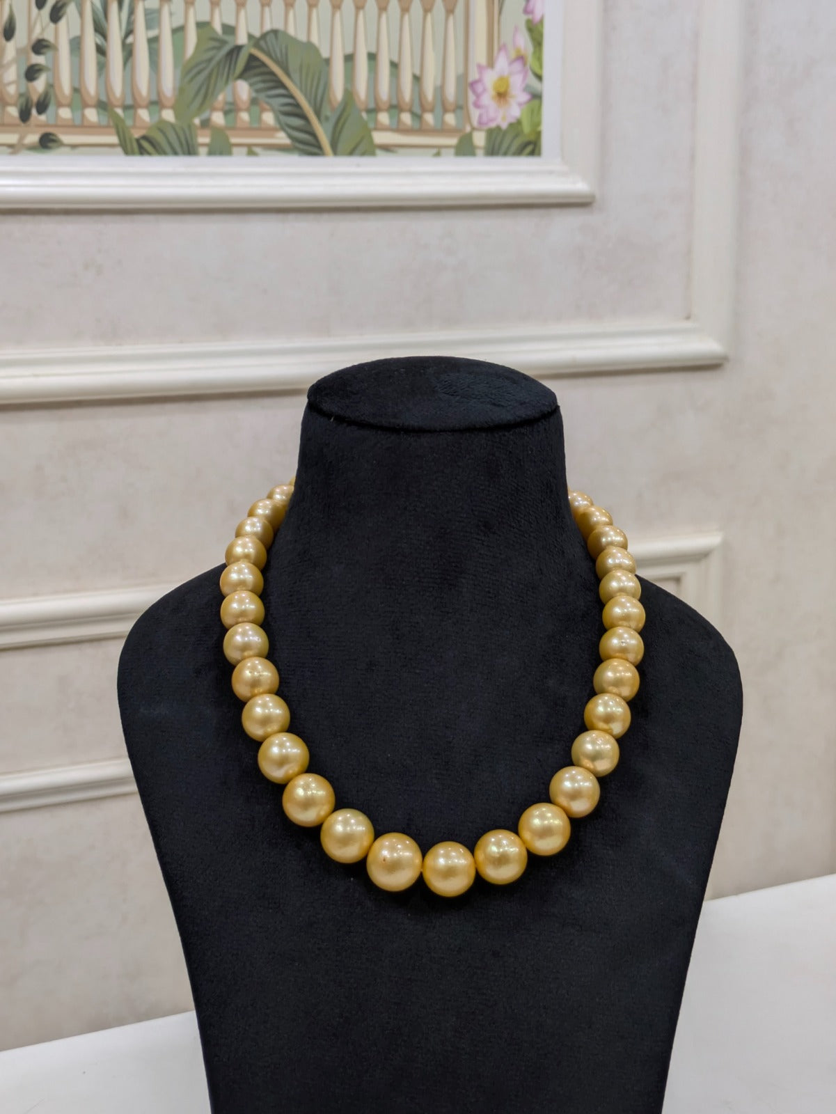 FreshWater Golden Pearl Necklace Elevate your jewelry collection with this exquisite freshwater pearl necklace, featuring lustrous golden pearls that radiate warmth and sophistication. Each pearl is naturally cultivated, showcasing unique variations in tone and surface that underscore its authenticity. The golden hue complements a wide range of skin tones and occasions, from everyday elegance to formal events. Freshwater pearls are renowned for their durability and affordability compared to saltwater varieties, making this piece an intelligent investment. The necklace combines timeless appeal with contemporary styling, perfect for those who appreciate refined craftsmanship and natural beauty.