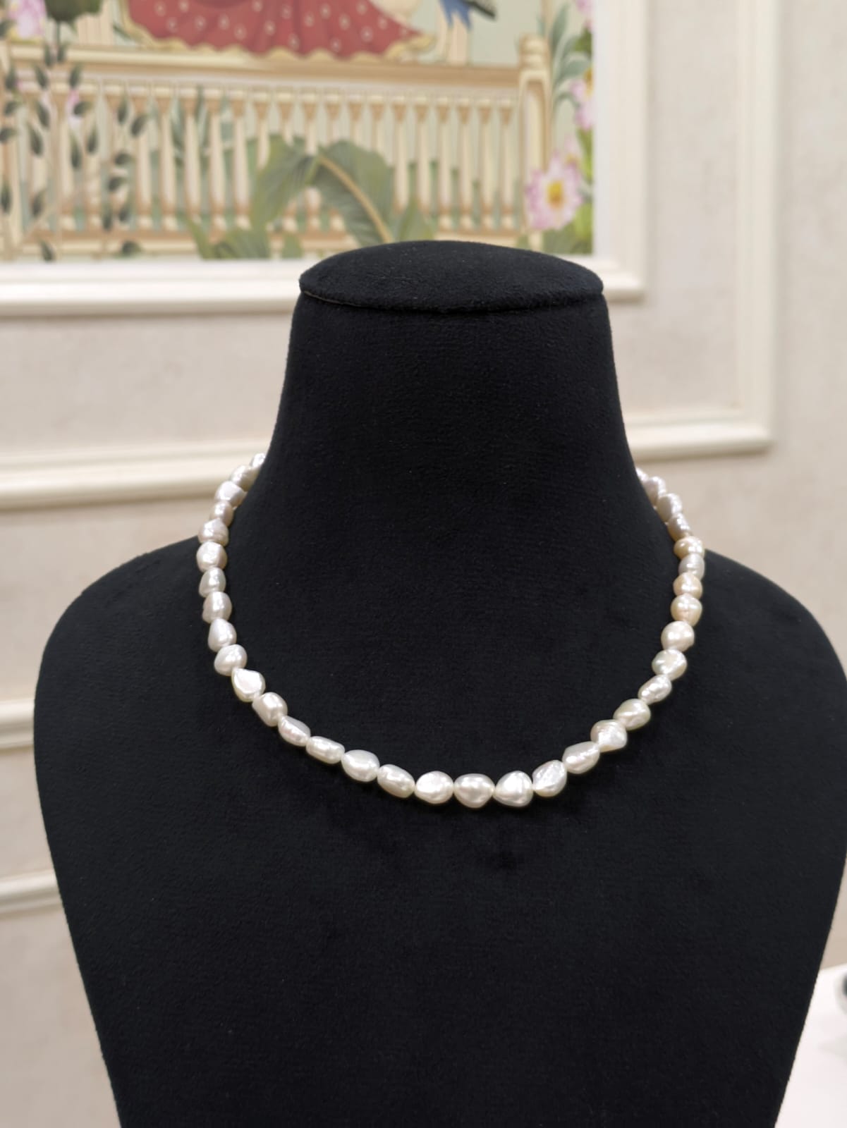 Keshi pearls are nature's unexpected treasures—baroque pearls formed without a nucleus, prized for their organic, luminous beauty. This White Keshi Pearl Necklace showcases the distinctive irregular shapes and lustrous surface characteristic of these rare gems. Each pearl's unique contours catch light beautifully, creating subtle depth and movement. The versatile white tone complements any complexion and pairs effortlessly with both casual and formal wardrobes. Keshi pearls are notably durable and develop a sophisticated patina over time, making this piece a timeless investment that grows more distinguished with wear.